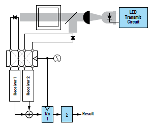 測(cè)量吸光度的光路配置如圖3所示。使用CN0503可以在任何光路(1到4)進(jìn)行吸光度測(cè)量。入射光束指向分束器,由參考光電二極管在分束器中對(duì)光束強(qiáng)度進(jìn)行采樣。剩余的光功率直接穿過(guò)樣本。采樣光與參考光的比值消除了LED光源的變化和噪聲,同步脈沖和接收窗口可提供環(huán)境光抑制。