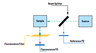 測(cè)量熒光的光路配置如圖10所示。使用CN0503,只能在光路1或4進(jìn)行熒光測(cè)量,因?yàn)樾枰褂?0°檢測(cè)器。通常,將熒光檢測(cè)器置于入射光90°的位置,使用單色或長(zhǎng)通濾光片來(lái)增加激發(fā)光和發(fā)射光之間的隔離。熒光是一種非常靈敏的低電平測(cè)量,容易受到干擾,因此采用參考檢測(cè)器和同步檢測(cè)方法來(lái)減少誤差源。