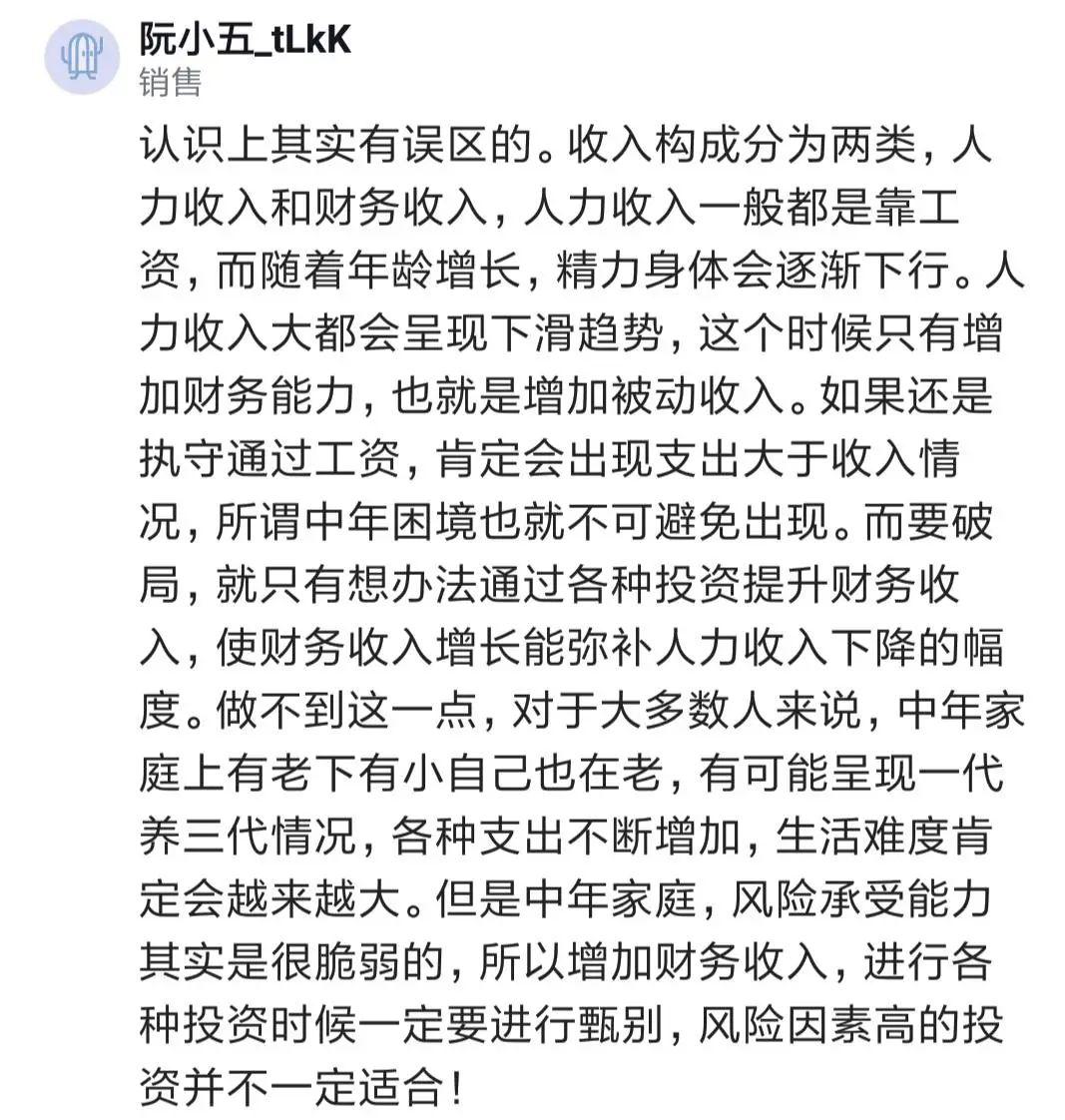 也有人說,收入分為人力收入和財務收入,人力收入靠工資,財務收入是被動收入。人力收入會隨著年齡增長逐漸下滑,需要通過各種投資提升財務收入,注意不要進行風險高的投資。