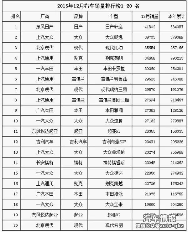 近日,中國(guó)汽車工業(yè)協(xié)會(huì)(簡(jiǎn)稱:中汽協(xié))公布了2015年12月份轎車銷量排行榜。榜單顯示:日產(chǎn)軒逸、大眾朗逸、現(xiàn)代朗動(dòng)、別克英朗和豐田的卡羅拉分列前五位。
