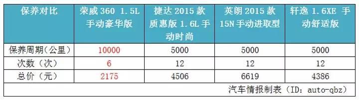 榮威360、英朗、軒逸這四款車都提供3年或10萬公里質保期,為了計算方便,我們選取6萬公里為節(jié)點進行對比,看看誰的保養(yǎng)費用最低。