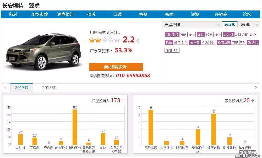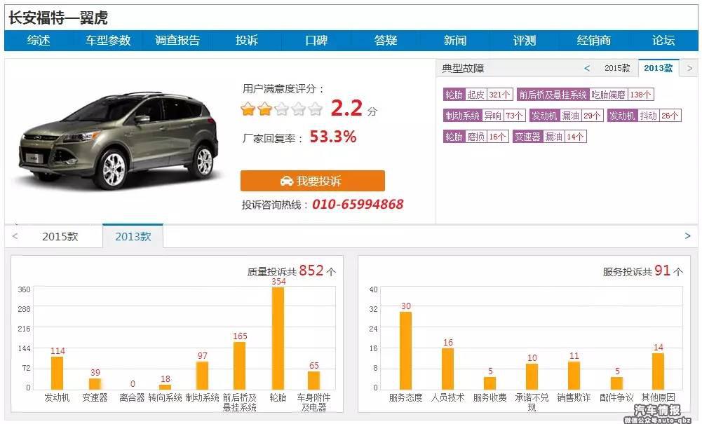 讓人欣慰的一點是,2015款翼虎的投訴量為178個,相較于2013款高達(dá)852個投訴量,足足下降了79%,看來,2015款翼虎在13款的基礎(chǔ)上還是做出了一定的調(diào)整和改進(jìn)。