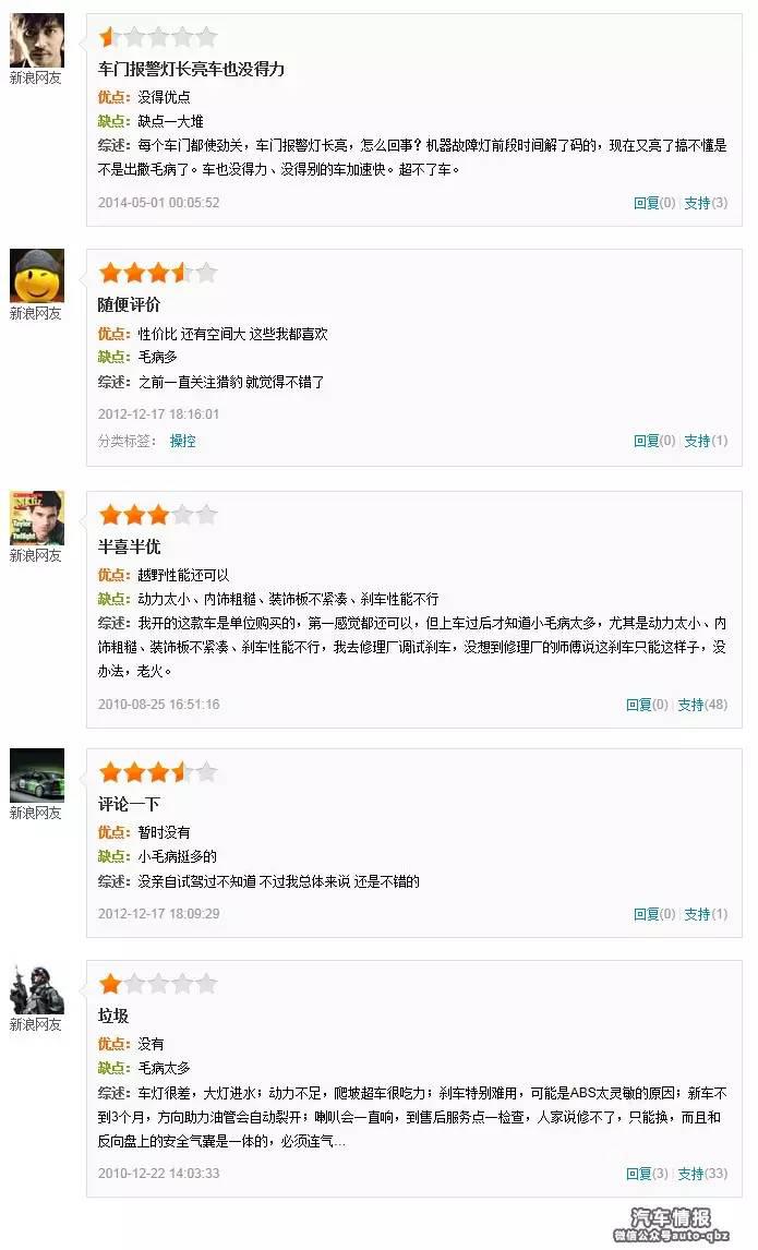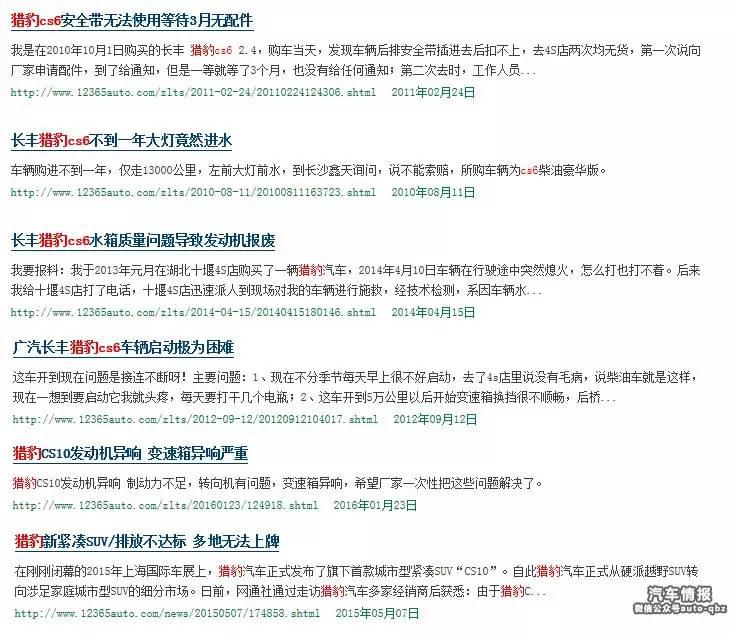 相對于同時期的中型SUV,獵豹CS6身上的小毛病的確是有點多,而這,也在一定程度上影響了消費者對其的信心,汽車情報在網(wǎng)上搜集了一下,詳見整理的資料。