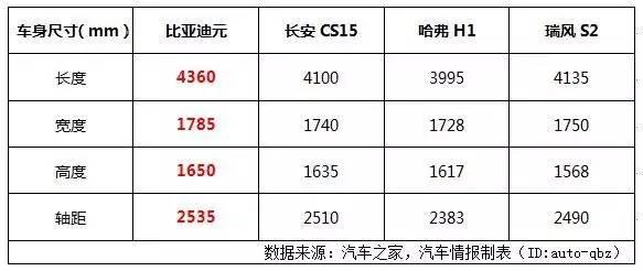在車身尺寸上,元的長寬高分別為4360mm、1785mm、1650mm,在小型SUV陣營里優(yōu)勢較為明顯,面對競爭對手長安CS15、哈弗H1、瑞風(fēng)S2,元全面勝出。尤其是軸距一項,達(dá)到難能可貴的1650mm,這要吊打哈弗H1的2383mm。