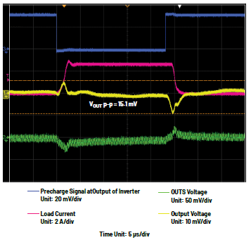 圖6.預(yù)充電信號和負(fù)載瞬態(tài)同時(shí)影響LT8625SP,實(shí)現(xiàn)快速恢復(fù)時(shí)間