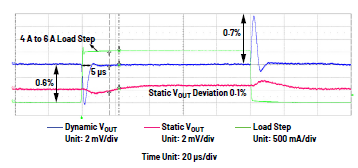 圖2.負(fù)載瞬態(tài)響應(yīng)很快,VOUT偏差極小,不會(huì)影響靜態(tài)負(fù)載