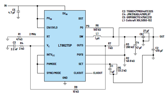 圖7.LT8627SP的OUTS和VC之間放置一個(gè)主動(dòng)降壓電阻,以實(shí)現(xiàn)快速瞬態(tài)恢復(fù)時(shí)間