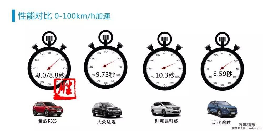 在更進一步的性能對比環(huán)節(jié)中,榮威RX5在0-100km加速中表現(xiàn)出來的實力讓人吃了一驚,8.0/8.8秒,這不正是表弟名爵銳騰“8秒破百”的即視感嗎?相比之下,昂科威10.秒,途觀9.73秒的加速成績確實讓人難以滿意。