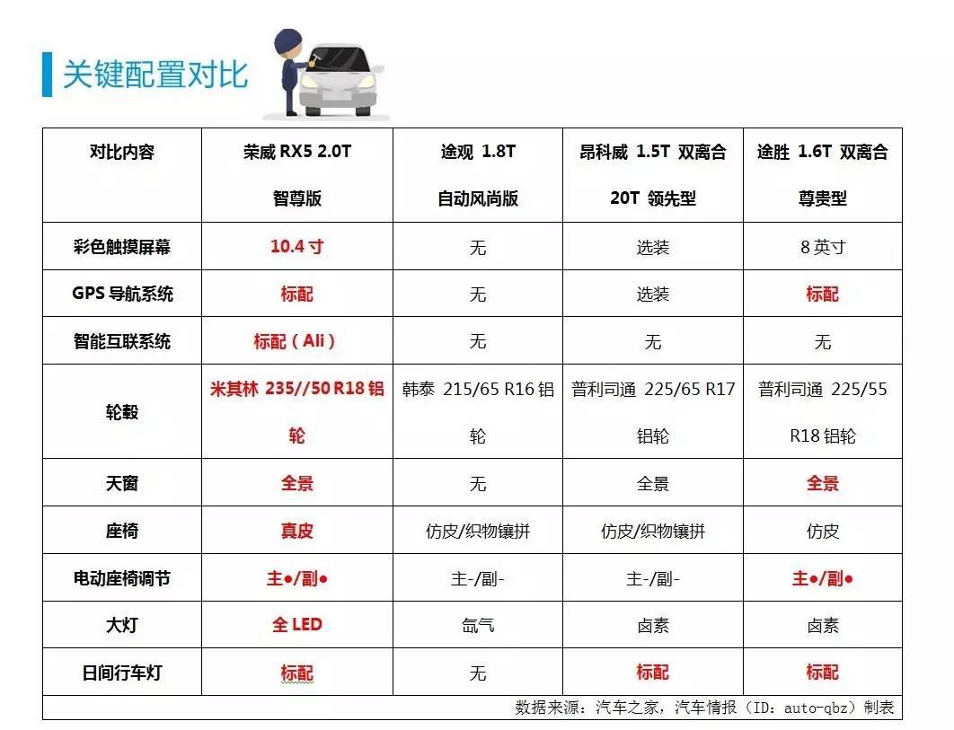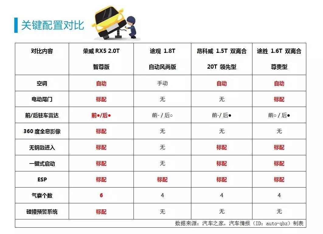 如果你認為榮威RX5提供的僅僅是上述的這些配置的話,那就圖樣圖森破了。其實,在自動空調(diào)、電動尾門、前后駐車雷達、360°全景影像、無鑰匙進入、一鍵啟動、ESP、6安全氣囊和防碰撞預(yù)警上,榮威RX5堪稱面面俱到。還是看一下途觀的配置單,一切的一切都釋然了。