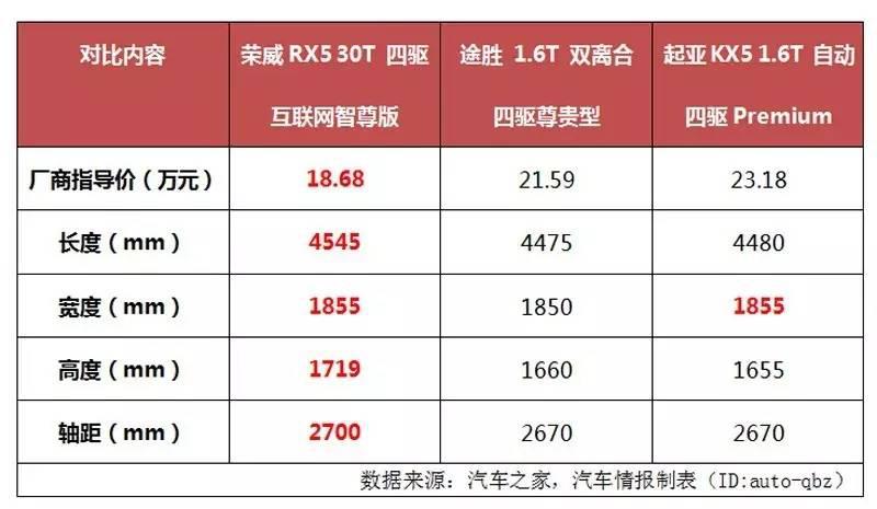判斷一款車的大小與否,數(shù)據(jù)是最直觀的,也是最有說服力的。從整理的車身參數(shù)表來看,標(biāo)紅的數(shù)字已經(jīng)說明了一切,榮威RX5除了在寬度上被起亞KX5逼平外,其他參數(shù)都要優(yōu)于兩位對手。