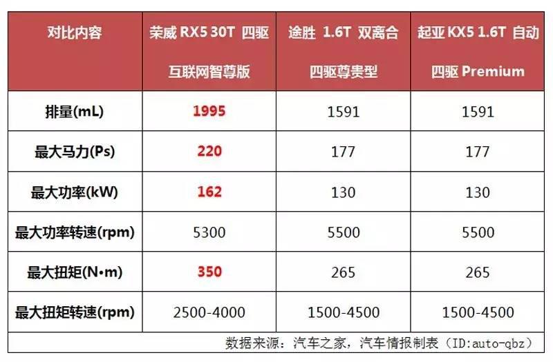 還是老規(guī)矩,先上數(shù)據(jù),用事實說話。從最大馬力、最大功率和最大扭矩這些核心參數(shù)上看,榮威RX5領(lǐng)先對手大半個身位,優(yōu)勢十分明顯。反觀途勝和起亞的1.6T渦輪增壓發(fā)動機,與RX5相比,就有點小巫見大巫了,如果放在載重低的轎車上,似乎還說得過去,可是偏偏用在了一輛自重約1.5噸的SUV身上,怎么看都有種小馬拉大車的感覺。