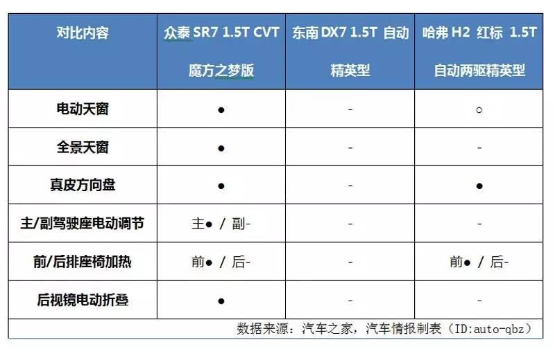 無獨有偶,在三款車的配置對比中,老司機們喜歡的這些配置只有眾泰SR7全部滿足,哈弗H2還算好些,提供了真皮方向盤和前排座椅加熱,并且可以選裝電動天窗。而東南DX7這配置“裸”的,全部都沒有。