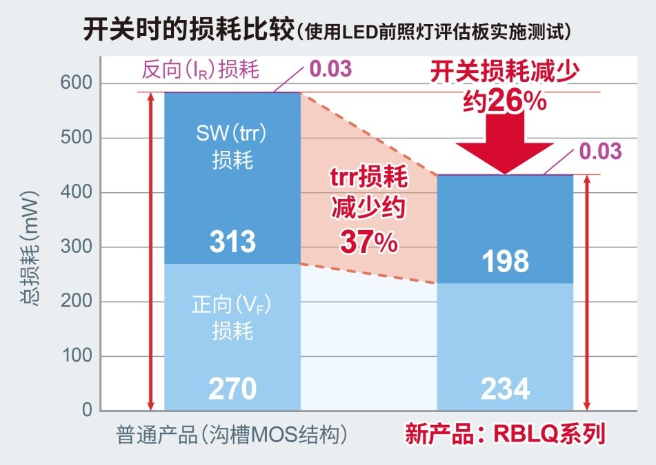 在普通溝槽MOS結(jié)構(gòu)中,寄生電容(元器件中的電阻分量)較大,因此trr要比平面結(jié)構(gòu)差。而RBLQ系列和RLQ系列新產(chǎn)品不僅降低了VF和IR,而且還利用自有技術(shù),通過優(yōu)化材料,實現(xiàn)了與平面結(jié)構(gòu)同等的trr特性。例如,從圖7中可以看到使用LED前照燈評估板進行裝機評估時的開關(guān)損耗比較情況。在開關(guān)過程中,因VF和trr引起的損耗比例比較高,但RBLQ系列和RLQ系列的trr損耗降低了約37%,VF也同時降低,因此開關(guān)總損耗降低達26%,這將有助于降低車載LED前照燈驅(qū)動電路、以及xEV用的DC-DC轉(zhuǎn)換器等需要進行高速開關(guān)的應(yīng)用產(chǎn)品功耗。