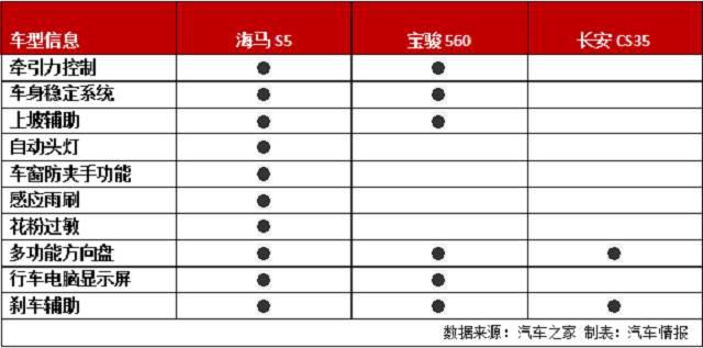 反觀寶駿560和長安CS35在表格中的配置,有點毫無還手之力的感覺。配置對比中,更為用心、更為豐富的海馬S5取得了勝利。