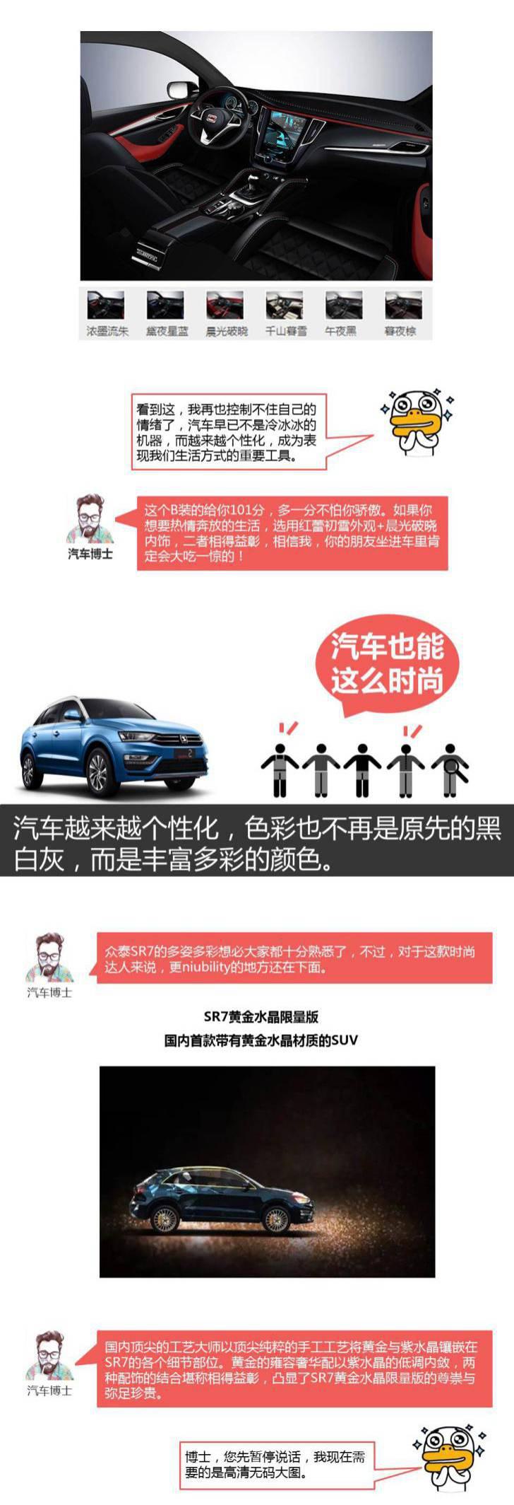 在眾泰SR7身上,我們可以看到:汽車越來(lái)越個(gè)性化,色彩也不再是原先單調(diào)的黑白灰,而是豐富多彩的顏色,并且是最大限度的DIY。