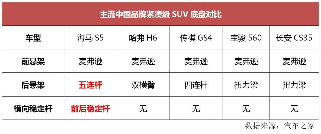 首先,先從海馬S5的產(chǎn)品競爭力說起。別的不說,先從最考驗SUV功底的底盤講起。細(xì)數(shù)市面上熱銷的幾款SUV車型,比如說:哈弗H6、傳祺GS4、寶駿560和長安CS35等,這些車除了寶駿560外,底盤懸架做的都還基本夠用,應(yīng)付城市道路是夠用了。