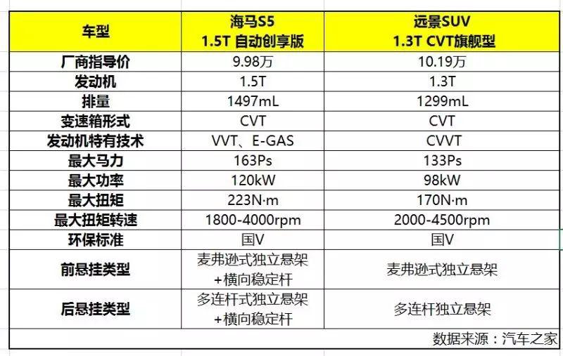 而遠(yuǎn)景SUV提供了1.8L自然吸氣發(fā)動(dòng)機(jī)+5擋手動(dòng)變速箱與1.3T發(fā)動(dòng)機(jī)+CVT自動(dòng)變速箱兩種動(dòng)力組合,其中,這臺1.3T發(fā)動(dòng)機(jī),最大功率98kW,最大扭矩185Nm,與海馬S5的1.5T動(dòng)力相比,要遜色不少,不過,應(yīng)付日常家用應(yīng)該是沒問題。