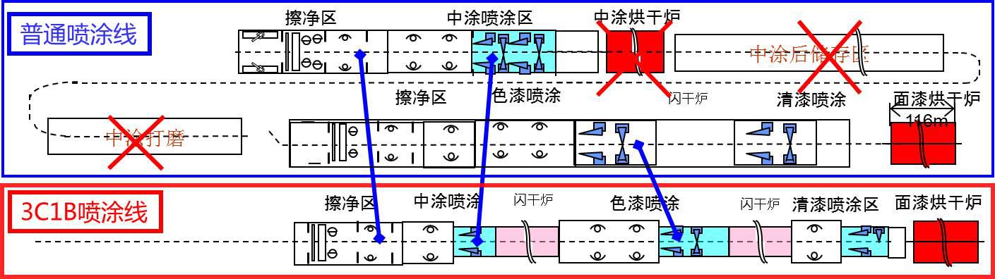 涂裝區(qū),3C1B(三次噴涂、一次烘干)的運用,減少了大量的電力、燃氣消耗,VOC減排50%。