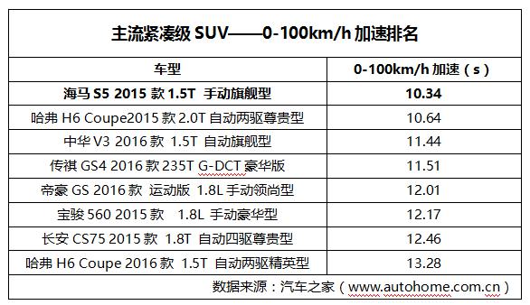 據(jù)汽車之家專業(yè)評測,海馬S5 1.5T手動旗艦版的0-100km/h加速時(shí)間為10.34s,100-0km/h剎車距離39.86m,在包括哈弗H6、傳祺GS4、長安CS75、寶駿560、帝豪GS、瑞風(fēng)S5、中華V3在內(nèi)的同級主流車型中,加速/制動性能綜合排名最佳。