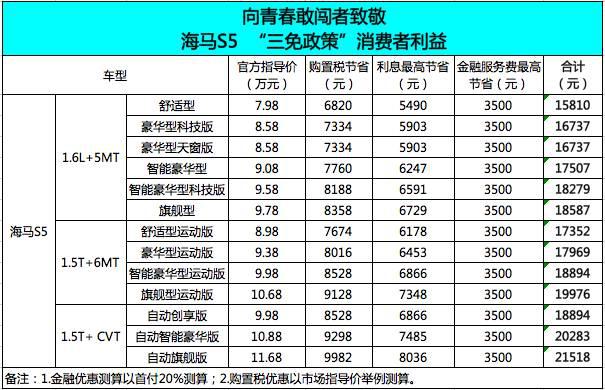 面對這樣一款品質(zhì)優(yōu)異且亮點(diǎn)突出的車型,你是不是動心了?現(xiàn)在購買海馬S5還可以享受超值鉅惠,目前“向青春敢闖者致敬 海馬S5三免鉅惠行動”活動正火熱進(jìn)行中,購買海馬S5全系任一車型可享受0購置稅、0利息、0金融服務(wù)費(fèi)的超級補(bǔ)貼,最高節(jié)省21518元!