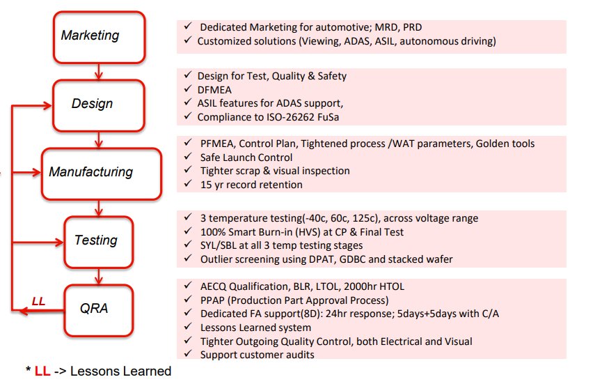 以豪威為例,針對車載CIS產(chǎn)品,豪威集團(tuán)實(shí)施全鏈質(zhì)量管控,通過APQP(產(chǎn)品質(zhì)量先期策劃),將質(zhì)量安全保障文化融入公司產(chǎn)品的每一個(gè)階段,從產(chǎn)品概念、設(shè)計(jì)、到封裝、測試,直至產(chǎn)品使用終止,并不斷優(yōu)化質(zhì)量安全機(jī)制、積累經(jīng)驗(yàn)。