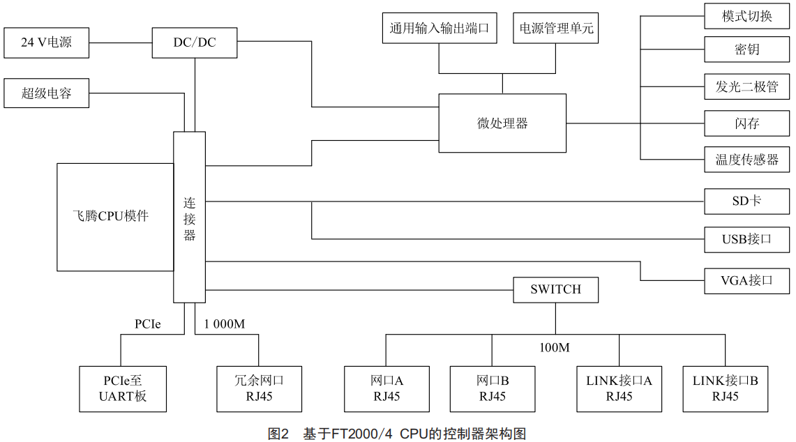 華電睿藍(lán)智能分散控制系統(tǒng)采用的是基于天津飛騰最新一代FT2000/4CPU研發(fā)的控制器,運(yùn)算能力更強(qiáng),功耗更低,擴(kuò)展了必要的外圍電路,包括電源轉(zhuǎn)換模塊、超級電容模塊、熱備網(wǎng)絡(luò)模塊、冗余通信網(wǎng)絡(luò)模塊、撥碼開關(guān)、存儲器模塊、測溫模塊、LED指示燈模塊、顯示模塊和USB接口模塊等。控制器的整體結(jié)構(gòu)如圖2所示。