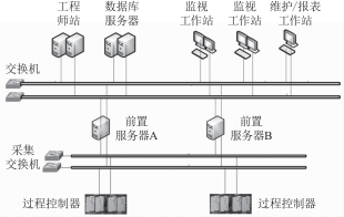 該系統(tǒng)主控通信網(wǎng)絡(luò)為連接分散控制系統(tǒng)中各過程控制站、人一機(jī)接口站(操作員站、工程師站)或人一機(jī)接口數(shù)據(jù)服務(wù)器的實(shí)時(shí)數(shù)據(jù)通信網(wǎng)絡(luò)。采用工業(yè)以太網(wǎng)交換機(jī)、全雙工模式工作,通信速率為100Mb/S,傳輸介質(zhì)采用超五類雙絞線或多模光纜。系統(tǒng)網(wǎng)絡(luò)拓?fù)淙鐖D1所示。
