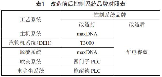 該機(jī)組原主機(jī)DCS、脫硫DCS為maxDNA系統(tǒng),汽輪機(jī)控制(DEH)為T3000系統(tǒng),吹灰控制為西門子PLC,電除塵控制為施耐德PLC,在本次改造中統(tǒng)一升級為華電睿藍(lán)智能分散控制系統(tǒng)。改造前后各系統(tǒng)所采用的控制系統(tǒng)品牌如表1所示。