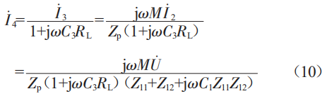 LCC-P型無(wú)線電能傳輸系統(tǒng)等效電路模型如圖2所示,其中U為交流電壓源,L1為串聯(lián)諧振電感,R1為電源內(nèi)阻和電感L1的等效電阻,C1、C2為并聯(lián)和串聯(lián)諧振電容,由此組成了LCC網(wǎng)絡(luò):Ls為發(fā)射線圈的等效電感,R2為L(zhǎng)s的等效電阻,Lp為接收線圈的等效電感,R3為L(zhǎng)p的等效電阻,C3為接收端的并聯(lián)補(bǔ)償電容,RL為負(fù)載電阻,M為發(fā)射線圈Ls和接收線圈Lp之間的互感系數(shù):11為發(fā)射回路總電流,12為發(fā)射端支路電流,13為接收端總電流,14為負(fù)載流過(guò)的電流。
