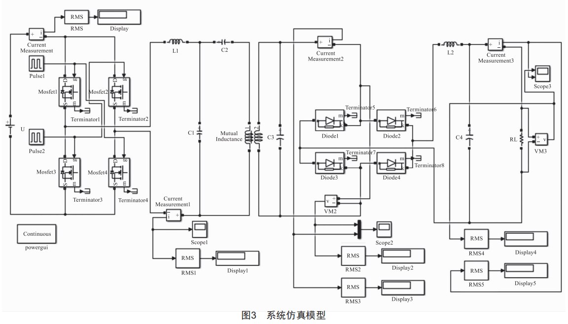 為了驗(yàn)證上述電路的正確性,在MATLAB/simulink中搭建出簡(jiǎn)單的LCC-P型無(wú)線電能傳輸系統(tǒng)的仿真模型,模型包括用4個(gè)M0SFET場(chǎng)效應(yīng)晶體管組成的單相全橋逆變電路、耦合補(bǔ)償電路、整流濾波電路,另外還有一些其他模塊用于測(cè)量電路的電壓和電流波形,如圖3所示,模型中參數(shù)設(shè)置如表1所示,為了便于分析,仿真時(shí)忽略電路的內(nèi)阻。