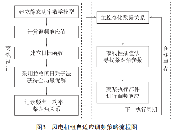 傳統(tǒng)調(diào)頻控制策略雖然能提供風(fēng)電調(diào)頻政策標(biāo)準(zhǔn)所要求的頻率支撐能力,但由此導(dǎo)致的風(fēng)電機(jī)組運(yùn)行效益低和發(fā)電量損失大的問題卻不能很好地解決,因此設(shè)計(jì)風(fēng)電機(jī)組自適應(yīng)調(diào)頻控制策略很有必要。本文所設(shè)計(jì)的調(diào)頻自適應(yīng)控制策略主要由離線設(shè)計(jì)與在線尋參兩部分構(gòu)成,如圖3所示,具體實(shí)現(xiàn)步驟如下。