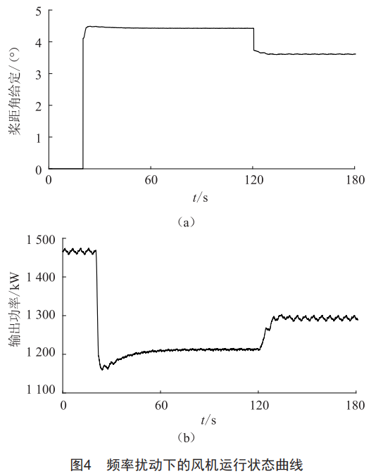 為驗(yàn)證上述控制器求解參數(shù)及本文控制策略的有效性,下文在風(fēng)機(jī)不同風(fēng)況、不同功率運(yùn)行點(diǎn)進(jìn)行仿真驗(yàn)證。首先設(shè)定電網(wǎng)初始頻率為50Hz,風(fēng)速為恒定風(fēng)速9m/s。在20s時(shí)風(fēng)機(jī)開啟調(diào)頻自適應(yīng)控制策略進(jìn)行調(diào)頻功率備用,在120s時(shí)電網(wǎng)頻率下擾至49.8Hz,該策略通過雙線性插值法進(jìn)行在線尋參工作發(fā)揮穩(wěn)定的功率支撐作用。從圖4可以看出,在20s時(shí)獎(jiǎng)距角增大進(jìn)行減載備用,穩(wěn)定后風(fēng)機(jī)輸出功率降低250kw左右,使其長(zhǎng)期保持0.1Pn的調(diào)頻能力。在120s時(shí),風(fēng)機(jī)通過雙線性插值法計(jì)算后減小獎(jiǎng)距角,增大輸出功率約75kw左右,滿足調(diào)頻標(biāo)準(zhǔn)要求。