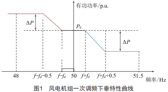 風(fēng)電在整個(gè)電力系統(tǒng)中的占比不斷上升,因此各地政策標(biāo)準(zhǔn)要求風(fēng)力發(fā)電具備參與一次調(diào)頻能力。在電網(wǎng)頻率變化超過一定范圍時(shí),風(fēng)電機(jī)組需按照預(yù)設(shè)的下垂特性曲線自動(dòng)增加或降低風(fēng)電機(jī)組出力來參與系統(tǒng)一次調(diào)頻,風(fēng)電機(jī)組一次調(diào)頻下垂特性曲線如圖1所示。
