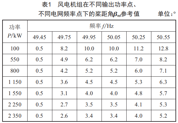 為驗(yàn)證上述風(fēng)電機(jī)組調(diào)頻自適應(yīng)控制策略設(shè)計(jì)的有效性,本文選擇容量2500kw雙饋機(jī)型進(jìn)行仿真驗(yàn)證,通過工業(yè)級(jí)仿真軟件Bladed進(jìn)行靜態(tài)功率仿真,記錄在不同風(fēng)速、獎(jiǎng)距角下風(fēng)電機(jī)組所對(duì)應(yīng)的功率值。設(shè)定頻率死區(qū)fd=0.05Hz、額定容量Pn=2500kw、調(diào)頻百分比AP=0.1Pn,通過在Matlab上編寫拉格朗日乘子法程序求解出在不同輸出功率點(diǎn)、不同電網(wǎng)頻率點(diǎn)下的獎(jiǎng)距角參考值,如表1所示。風(fēng)機(jī)根據(jù)輸入的實(shí)時(shí)頻率、功率信息以及頻率f一功率P一獎(jiǎng)距角8ref關(guān)系,采用雙線性插值法循環(huán)進(jìn)行調(diào)頻自適應(yīng)在線尋參工作。