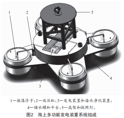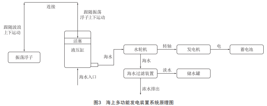 本文所設(shè)計(jì)的海上多功能發(fā)電裝置系統(tǒng)組成如圖2所示,其主要由4個振蕩浮子、液壓缸、水輪機(jī)、發(fā)電機(jī)、海水凈化裝置、蓄電池、儲水箱和平臺等組成。將振蕩浮子置于平臺四周,限制其水平移動,在垂蕩方向上帶動液壓缸的活塞桿上下移動,并完成吸水、排水的過程,將排出的具有高動能的海水作用于水輪機(jī),從而驅(qū)動發(fā)電機(jī)進(jìn)行發(fā)電,并將電量儲存于蓄電池中供來往船只使用。從水輪機(jī)中流出的海水進(jìn)入海水凈化裝置中進(jìn)行凈化,凈化完的水流入儲水罐中供來往船只使用,未凈化的水流入海洋中。系統(tǒng)原理圖如圖3所示。
