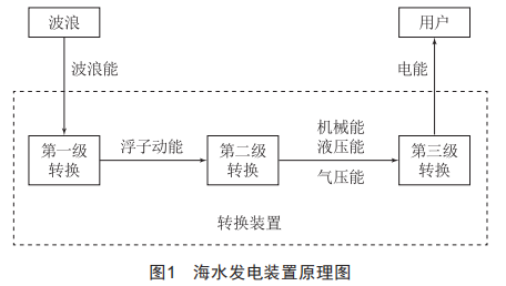 目前,世界上的波浪能發(fā)電裝置主要有振蕩浮子式、點(diǎn)頭鴨式、振蕩水柱式、擺式、閥式和越浪式幾種,雖然這些發(fā)電裝置結(jié)構(gòu)不同,各有特點(diǎn),但其基本原理都差不多。這些裝置將波浪能轉(zhuǎn)換為電能一般都要通過三級轉(zhuǎn)換:第一級轉(zhuǎn)換是通過與波浪接觸的浮體或擺子吸收波浪能并將其轉(zhuǎn)換為浮子或擺子的動能,其完成轉(zhuǎn)換的裝置稱為采能裝置:第二級轉(zhuǎn)換是將浮體或擺子的動能轉(zhuǎn)換為齒輪動能、液壓能或氣壓能,完成該轉(zhuǎn)換的裝置稱為能量轉(zhuǎn)換裝置:第三級轉(zhuǎn)換是將相應(yīng)的機(jī)械能、液壓能或氣壓能轉(zhuǎn)換為電能。這三級是相互聯(lián)系、相互影響的,原理圖如圖1所示。