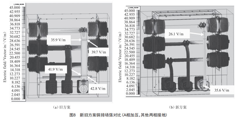 圖8為模擬分析結(jié)果,由結(jié)果可知,母線由銅排改為銅管后電場(chǎng)分布得到了改善,銅管表面氣體中電場(chǎng)分布均勻度明顯提高,相同位置的場(chǎng)強(qiáng)降低了約30%,這種設(shè)計(jì)大大提高了開(kāi)關(guān)柜的絕緣性能。