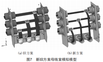 通過(guò)計(jì)算機(jī)軟件模擬分析銅管母線及其固定裝置和傳統(tǒng)矩形母線及其固定裝置設(shè)計(jì)在開(kāi)關(guān)柜中的電場(chǎng)強(qiáng)度,模擬模型為柜寬800mm的開(kāi)關(guān)柜母線室,如圖7所示,由圖可知,銅管對(duì)地和相間空氣凈距比矩形母線增大了。