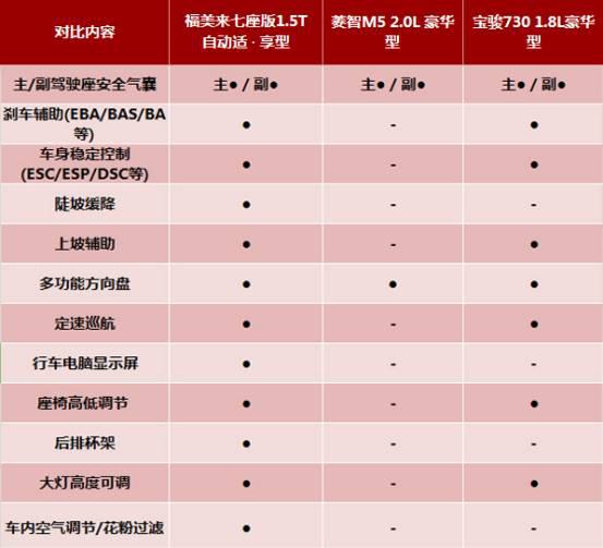主副安全氣囊是必不可少的,三款車都配備。但在其他配置上福美來七座版碾壓菱智M5和寶駿730,不僅良心配備了一般在豪車上才會配置的陡坡緩降功能,還配備了定速巡航、行車電腦顯示屏、上坡輔助等行車輔助功能,讓開車的人更加方便舒適。