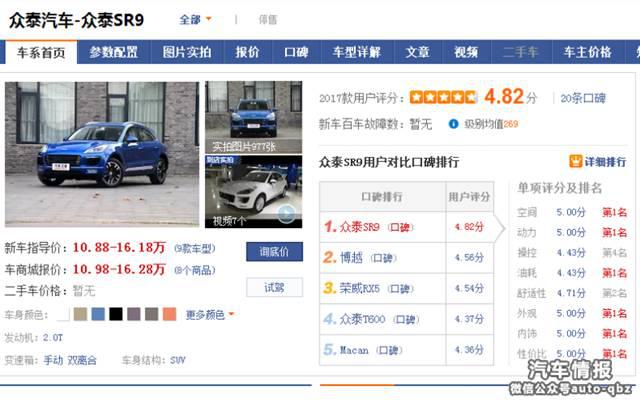 當(dāng)然,作為十幾萬的產(chǎn)品,有些不能只看數(shù)據(jù),畢竟汽車這東西還是真正的產(chǎn)品實力才能打動人心,而最具說服力的無疑是真正購買且使用過SR9這款車的真實車主的聲音。上圖是筆者剛在權(quán)威媒體汽車之家網(wǎng)站上截的圖,從右半部分的“用戶對比口碑排行”來看,眾泰SR9在外觀、內(nèi)飾、空間、動力、油耗以及性價比幾個方面都排在了首位,由此看來車主朋友們對SR9還是非??隙ǖ?,畢竟產(chǎn)品力在那里擺著,想說瞎話也騙不了人。