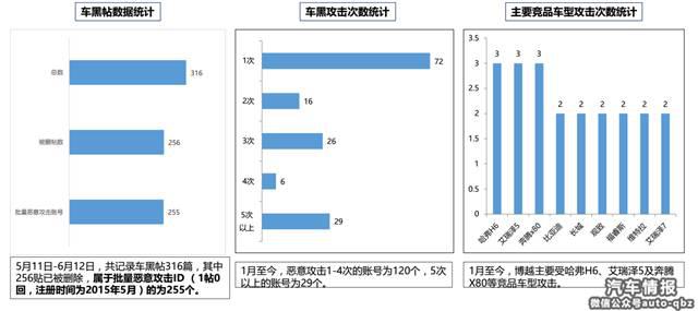 從2017年一月至今,據(jù)統(tǒng)計(jì),在互聯(lián)網(wǎng)論壇上,共記錄車黑賬號364個,共記錄攻擊博越的論壇車黑賬號151個!