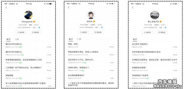 這樣的賬號主要有這么幾種類型:1.屬于認(rèn)證車主賬號,從未分享過購車、用車經(jīng)歷,以發(fā)攻擊博越的帖子為主;2.注冊時間早于博越上市時間,且注冊后,所發(fā)帖子內(nèi)容主要為攻擊博越;3.關(guān)注競品車型的賬號,主要攻擊博越;4.屬于三無賬號,無頭像、無認(rèn)證、無回復(fù)。