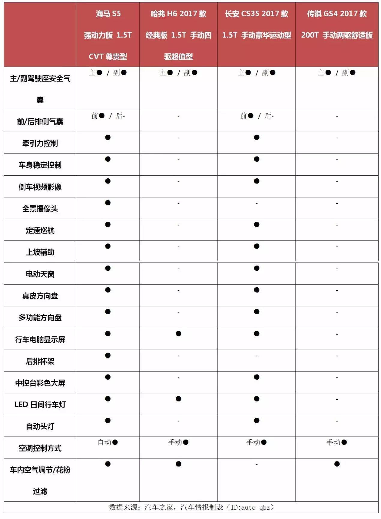 如下表所示,小編羅列了包括主/副駕駛座安全氣囊、前/后排側(cè)氣囊、牽引力控制、車身穩(wěn)定控制、倒車視頻影像、全景攝像頭等18項日常用到的一些核心配置,包含了安全、科技、日常生活等方方面面。然整體下來,海馬S5的優(yōu)勢最為突出。