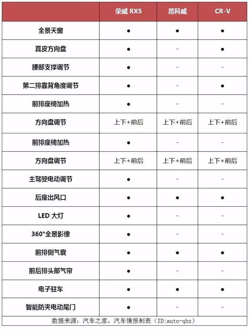如下圖所示,放眼望去,三款車子的配置做的都還算是不錯(cuò),像方向盤調(diào)節(jié)、前側(cè)側(cè)氣囊和電子駐車這些功能都具備。但是,如果仔細(xì)觀察的話,會(huì)發(fā)現(xiàn)榮威RX5的配置還是要優(yōu)秀的多,下列14項(xiàng)配置一個(gè)不落的提供,相比于昂科威和CR-V來(lái)講,優(yōu)勢(shì)明顯,其中,像LED大燈、智能防夾電動(dòng)尾門這些配置更是做到了自家獨(dú)有。