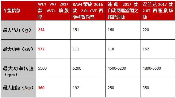動(dòng)力總成方面,VV7搭載的是2.0T+7DCT的組合;RAV4采用的是2.0L+CVT(模擬8檔)、途觀采用的1.8T+6擋手自一體、漢蘭達(dá)搭載了2.0T+6擋手自一體的組合,這四組動(dòng)力總成最優(yōu)秀的無疑是最大馬力(Ps)234、最大功率(kW)172、最大扭矩(Nm)360的VV7了。即便是同樣搭載2.0T的漢蘭達(dá),也因?yàn)閂V7搭載的7DCT變速箱而敗下陣來。