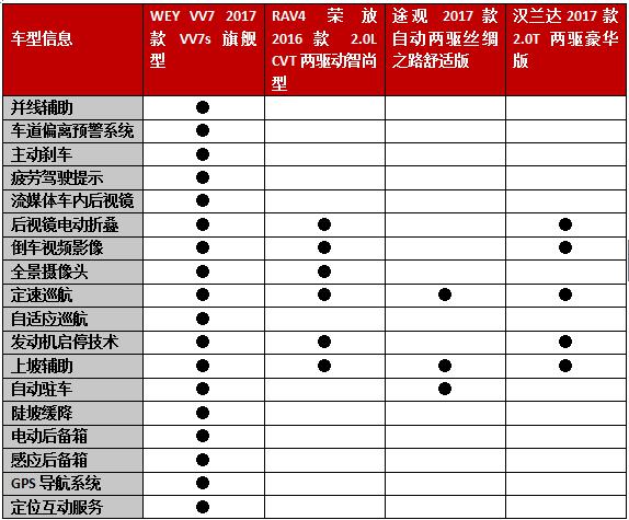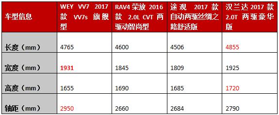 而在車身尺寸上,都說漢蘭達(dá)大塊頭,跟VV7一比也不過是彼此彼此,RAV4和途觀更是呈現(xiàn)出被碾壓的樣子。