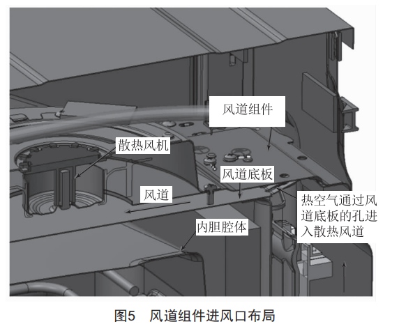 內(nèi)膽腔體外后部的高溫?zé)崃拷?jīng)風(fēng)道底板上的孔通過散熱風(fēng)機(jī)抽取(圖5),排到機(jī)體外,以減少內(nèi)膽腔體外后部溫度對電子元器件的損傷。