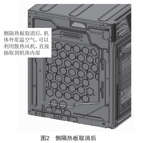 側(cè)隔熱板取消后,機(jī)體外的常溫空氣利用散熱風(fēng)機(jī)的抽取,可以直接進(jìn)入機(jī)體內(nèi)部,增大了進(jìn)風(fēng)口的面積,提高了散熱的風(fēng)量:另外,左右共2個側(cè)隔熱板在一定程度上提高了產(chǎn)品成本,取消側(cè)隔熱板后對產(chǎn)品的外觀并不造成影響(圖2),因此取消側(cè)隔熱板在一定程度上可以降低產(chǎn)品成本,提高產(chǎn)品市場競爭力,并改善產(chǎn)品的散熱性能。