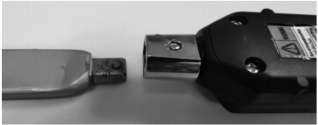 在較接銷子扳手的手柄后端焊接一個(gè)凸方頭,用以對(duì)標(biāo)插入數(shù)顯扭力器9mm×12mm的國標(biāo)凹方頭,實(shí)現(xiàn)二者的配合使用,如圖6所示。焊接的凸方頭兩端各有一凸起部分,用于卡位,保證了較接銷子扳手與數(shù)顯扭力器連接穩(wěn)固且拆卸方便,改裝組合后的工具如圖7所示。