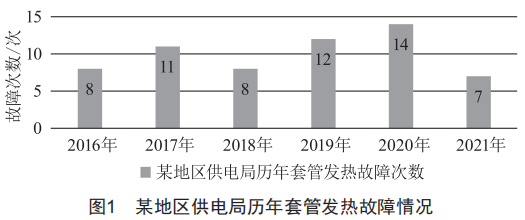 近些年,電力系統(tǒng)發(fā)生過多起變壓器運(yùn)行事故,其中變壓器套管的事故率占據(jù)較大比例。目前,傳奇電氣(沈陽)有限公司套管將軍帽(以下簡稱"傳奇將軍帽")的使用量龐大,日常運(yùn)維中,變壓器套管發(fā)熱故障頻發(fā),處理效果并不理想。某地區(qū)供電局共有23臺(tái)220kV變壓器、140臺(tái)110kV變壓器使用傳奇將軍帽。據(jù)統(tǒng)計(jì),該供電局近年傳奇將軍帽套管發(fā)熱情況如圖1所示,某變電站#1主變變中B相傳奇將軍帽發(fā)熱情況如圖2所示。